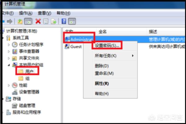 6、进入计算机管理页面,在左侧点击用户选项,右键要设置密码的用户选择“设置密码”。